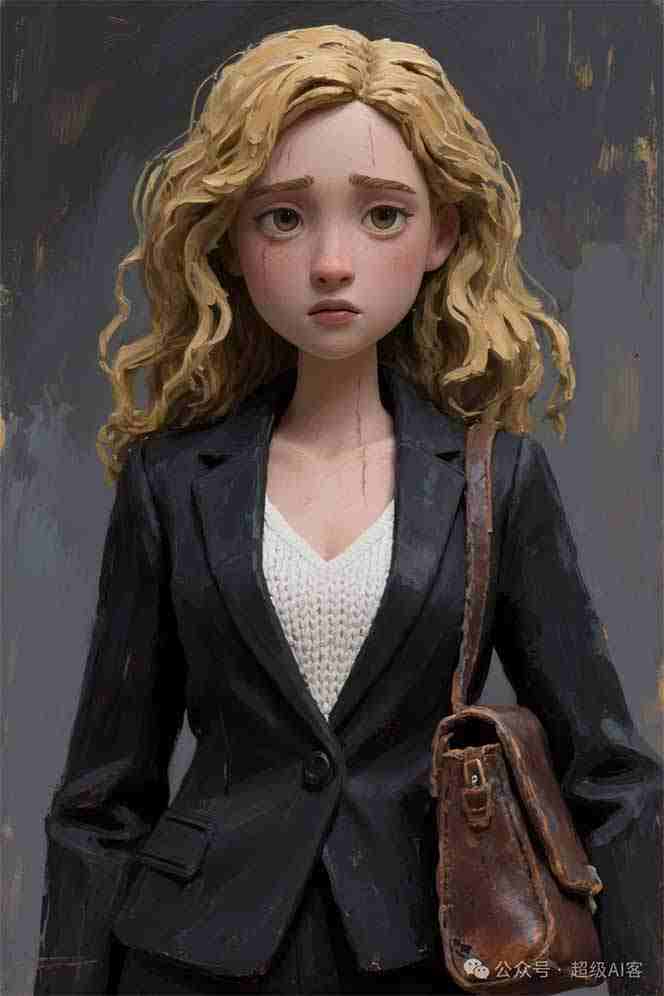 ***她有一张精致的、略显憔悴的脸庞,被她那长长的金#波浪卷发,每一缕发丝都像是用厚涂技法(impasto)精心塑造的,带有清晰的笔触痕迹。她那双杏仁状的大眼睛忧郁地低垂着,小巧而精心雕琢的嘴唇微微张开。她身着一套剪裁利落的黑#西装,西装外套的布料上能看到哑光的、有质感的笔触。西装内搭一件洁白的白#v领毛制吊带,其针织纹理通过精细的油彩凸起巧妙地表现出来。她的一只胳膊上挎着一个牛皮包,包的表面呈现出一种带有磨损感的皮革质地。