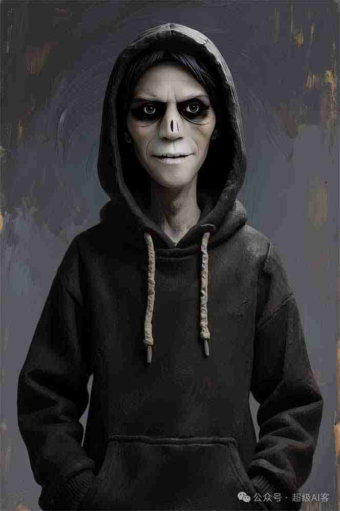 ***男子正对镜头,他的皮肤,是用厚涂技法(impasto)的油彩渲染出的病态惨灰白#,这个男子穿着一件黑#连帽衫)。强烈的明暗对照效果(Chiaroscuro)将他孤独的身影置于画面的视觉中心。